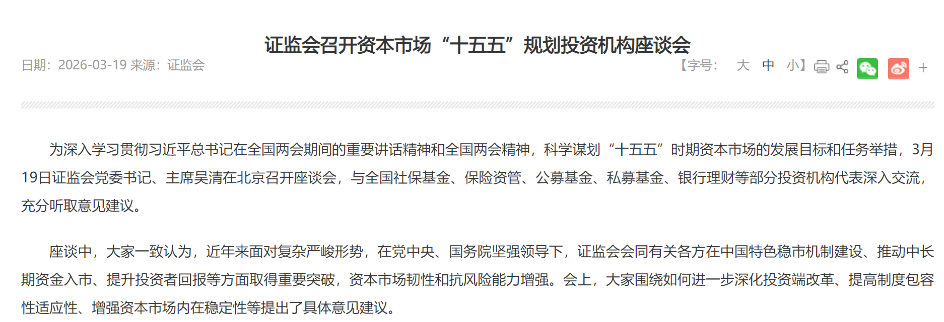 证监会发布座谈会相关信息。这场会议的首个核心看点,便是座谈主体精准指向了投资机构。这是“十五五”规划公布后,监管层面首场明确市场参与主体定位的专题座谈会,分量不言而喻。对比近期监管会议,此前证监会党委召开的传达学习习近平总书记重要讲话精神、全国两会精神会议,以及2026年全面从严治党暨纪检监察工作会议,均偏向宏观层面部署与方向性。
